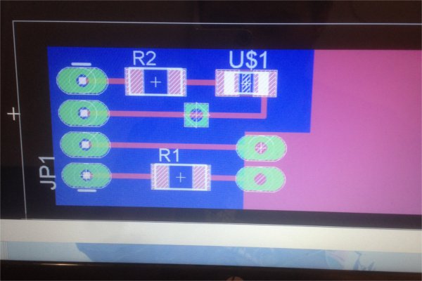 the next step was to make the schematic in eagle. I added a voltage polarity protector (with a p channel mosfet transistor- as shown in this video), a voltage regulator with two decoupling capacitors, and a resonator. I also decided to reuse part of my hello world board file to savetime on untangling the rats nest. This ultimately made the board bigger than it needed to be, but I was short on time (as I most usually am) so I wasnt too worried.
