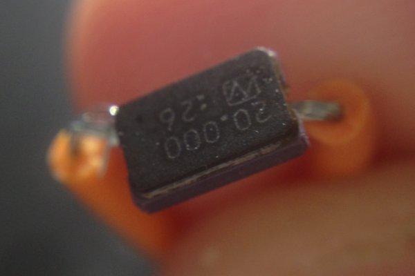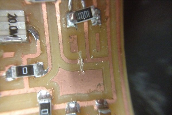 While I was doing that there was a development to the agreed upon network specifications: all the boards needed to use a 20 mhz crystal. My previous board used a resonator clock which wouldnt do. I scratched off the traces and soldered the crystal to the pins of the attiny with some jumper cables (badly). I am surprised the crystal wokred afterwards!