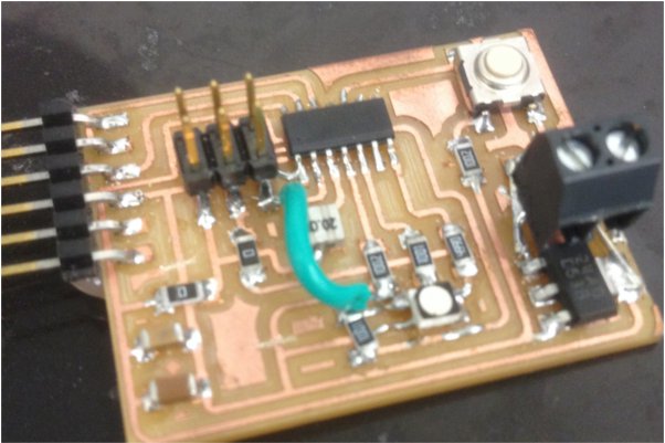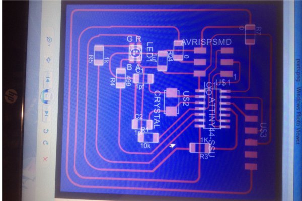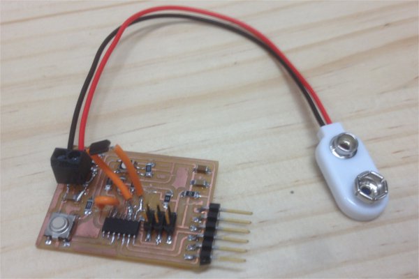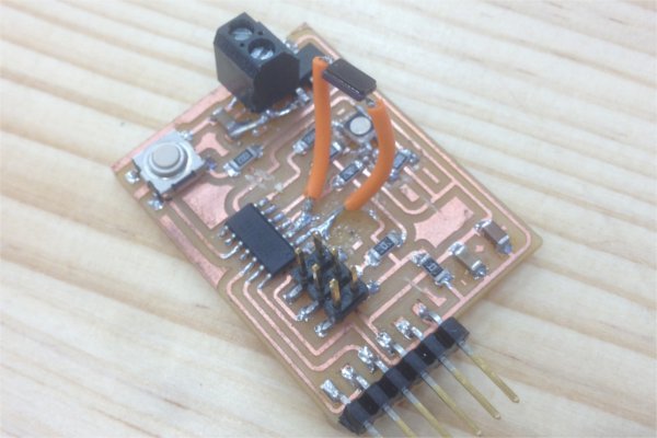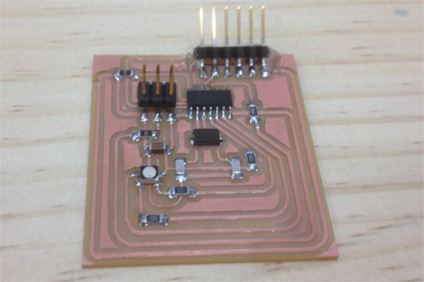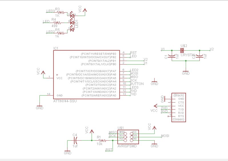 I wanted to use my breakboard from the output devices class, however, I still can't get it working. As an alternative I decided to modify my hello board from the electronics design week. The reason I needed to modify it was that the board needed to have a VCC line to the attiny to program and run the network, but not have this VCC line attached to the AVRISP header as there would be a voltage already projected through the serial line.