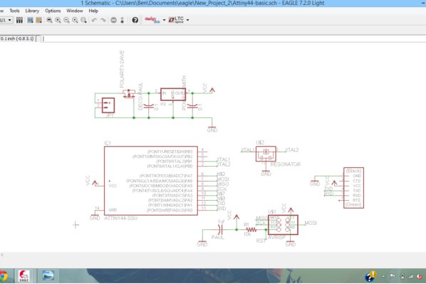 While I was designing the schematic file I realised I was using the same 5 components for every board I made, a screw terminal for the battery, a p channel mosfet for polarity protection, a voltage regulator with decoupling capacitors, an avr isp header and a ftdi header for the Attiny44. So I decided to make a board with just these components and pins to plug everything else in. I thought it would work kind of like a bad arduino, or a Baduino (on account of using an Attiny instead of the bigger and more powerful Atmega).