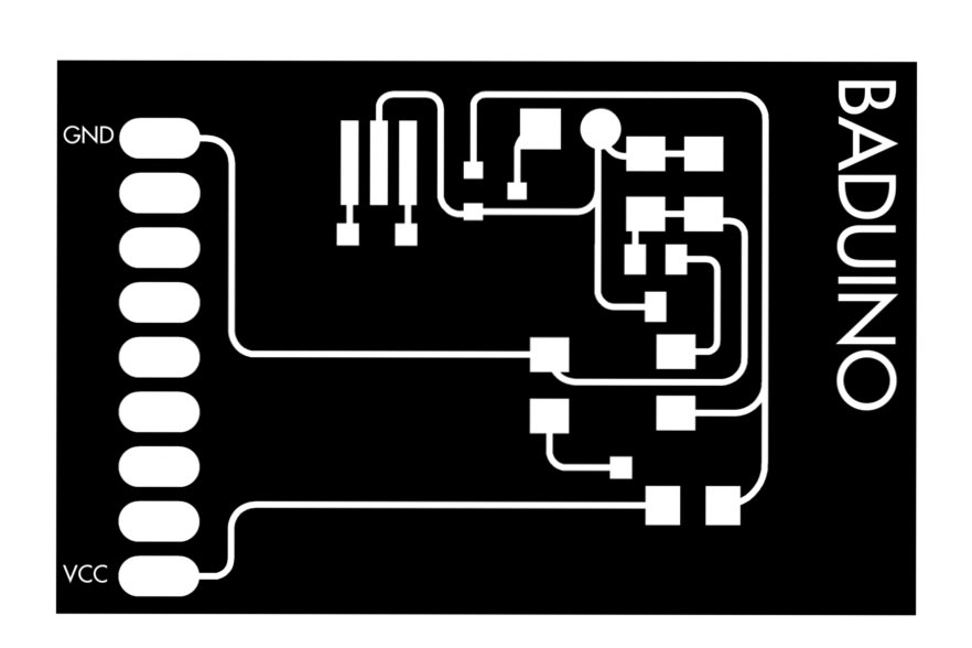 There were multiple issues when it came time to cut the Baduino. Firstly we (fellow fab academy student Geoff and I) exported the eagle file incorrectly, and after cutting the holes and vias wrong, needed to invert the png colours.