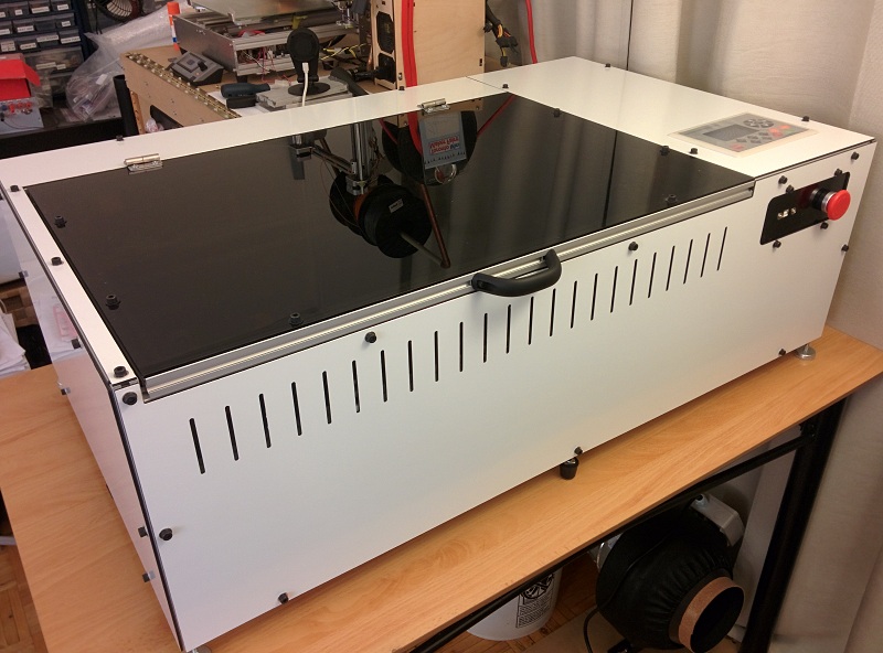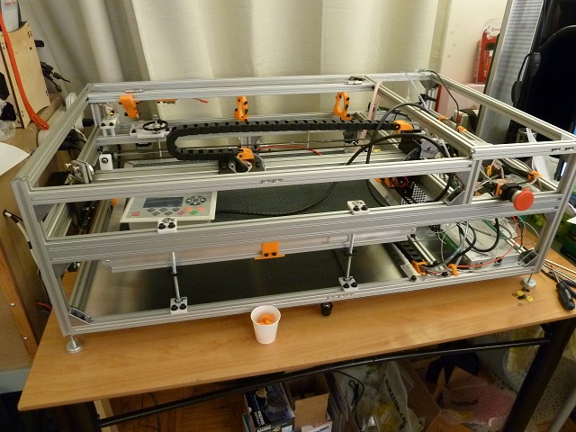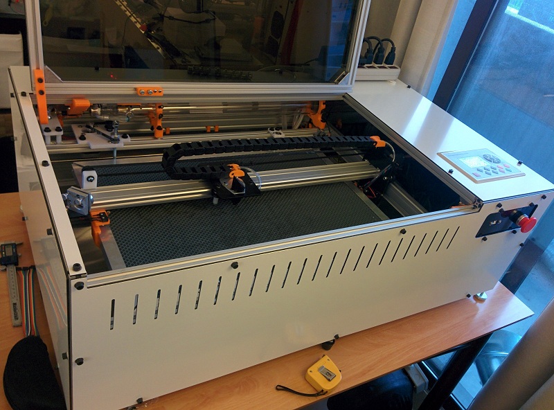 Here you can see the inner work of the laser cutter. The white plastic parts were cut out with a Shapeoko2 CNC, and the orange parts are print with a 3D printer I build and modified from a MeldelMax2.