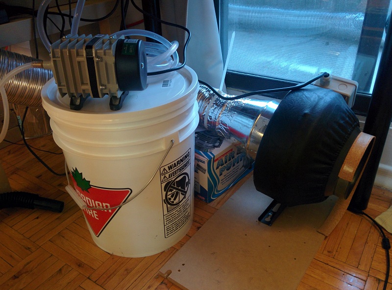 -The air compressor (sitting on the bucket) for air assist laser head. (To blow the smoke away from the focus lens)