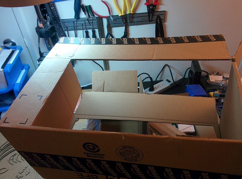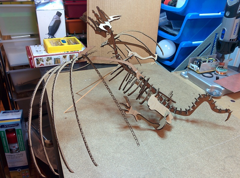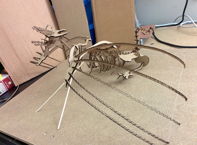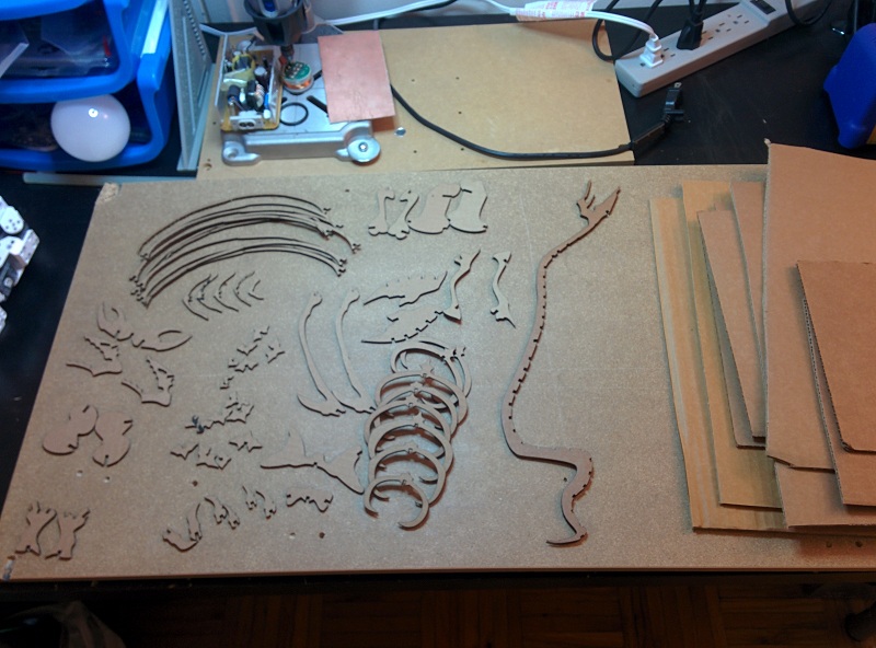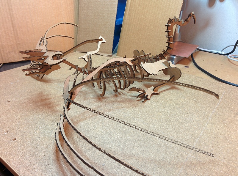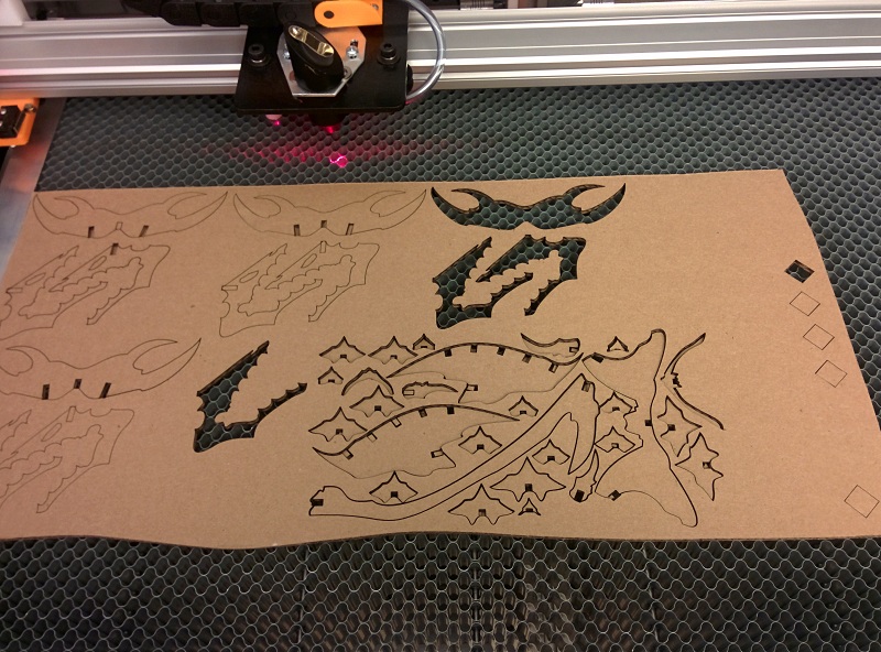 Cutting everything out with the smally laser cutter I build myself. The multiple heads cut lilne on the left shows the calibration process for figuring out the power and speed for cutting amazone box carboard. Note to self, the temperature outside, where the laser cutter pull the vantelation air from, actually effect the power needed to cut the smae material. (-20 degree celsius here in Canada at the time of cutting...)