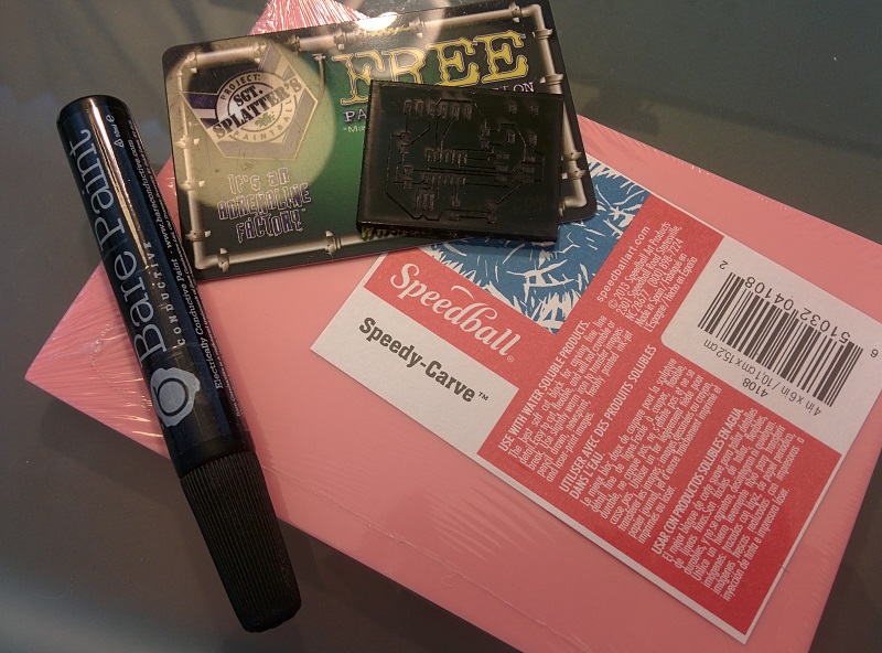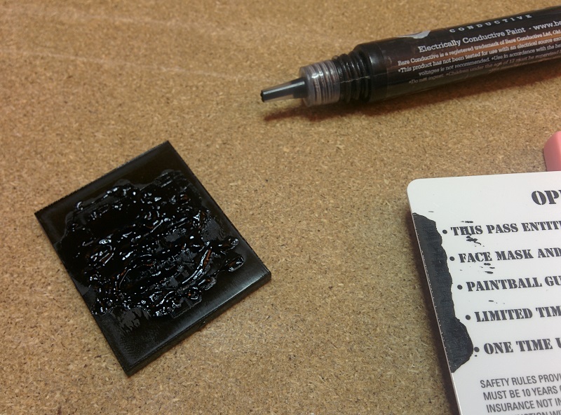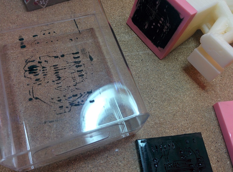 With only paint left in the traces on acrylic, I used the stamp rubber to transfer the PCB trace shaped paint onto a piece of clear plastic (in theory, can be any surface that's not conductive). The transfer process is to simply press the stamp rubber onto the paint filled acrylic to collect the paint, and use the same stamp rubber to stamp onto a surface of ur choice.