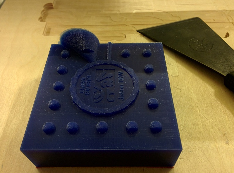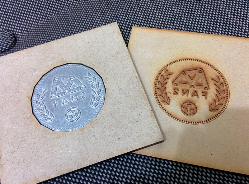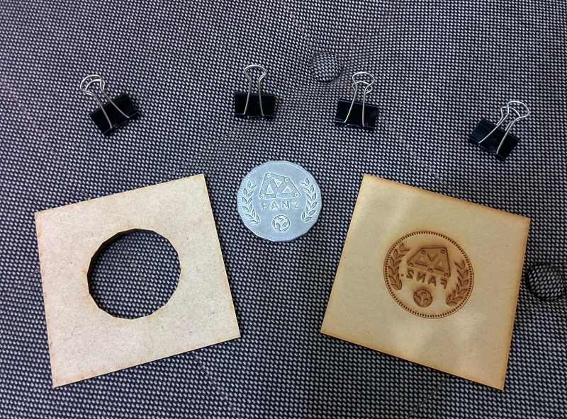 Here is the result of the workshop I host within Fan2. One laser cutted 6mm MDF acts as boundry, and one engraveds 3mm MDF provides the face mold of the coin.