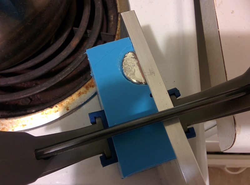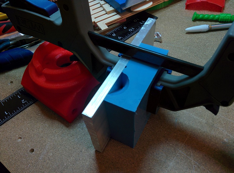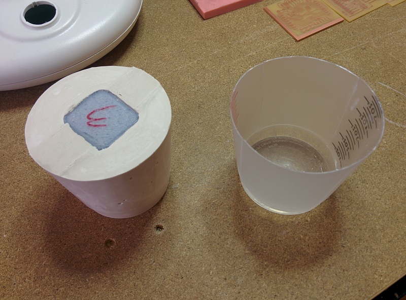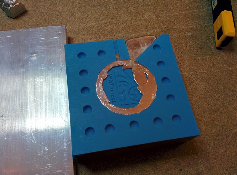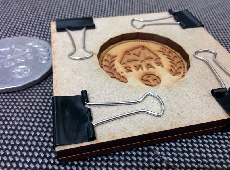 Two pieces mdf clamped together to provede a mold for a one sided coin.