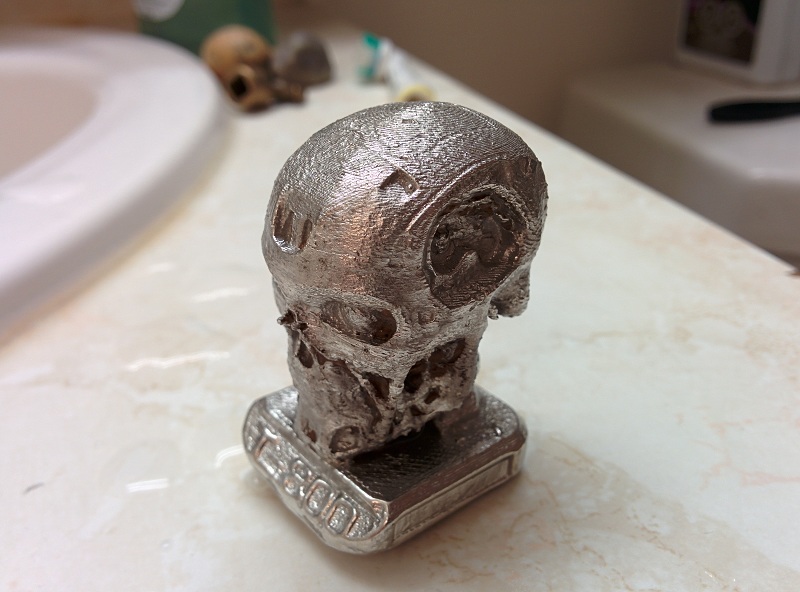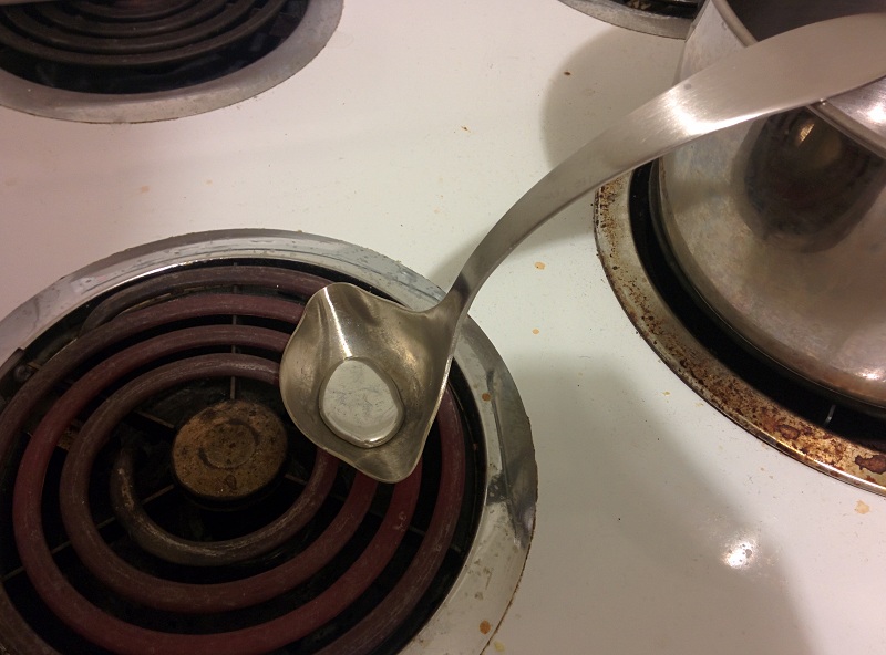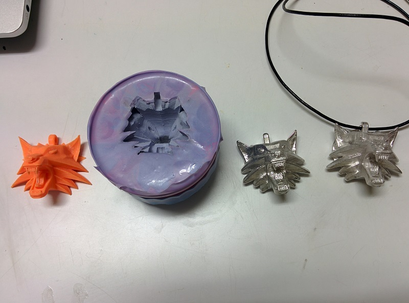 First, I need to make sure the mold material and casting material can work together, so I grab a random 3D print (a creepy teeth in this case because the no overhang feeature of it) and start the test process. "Smooth-Sil 950" mold with the 3D printed teeth in it. I use a stainless soup ladel to melt the pewter metal on stove top, and pour the molten metal into the mold after removing the 3D printed teeth. Taadaa! A set of metal teeth. The mold and metal combination works! And is able to capture all the detail from the 3D print, even the 0.1 layers are clearly transfered.