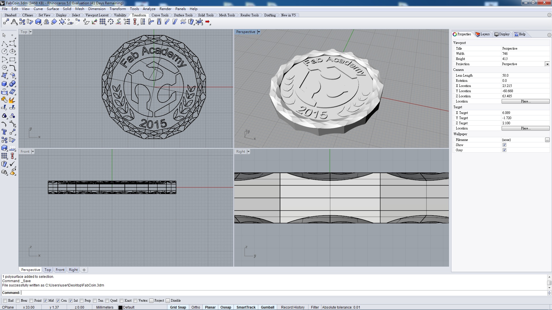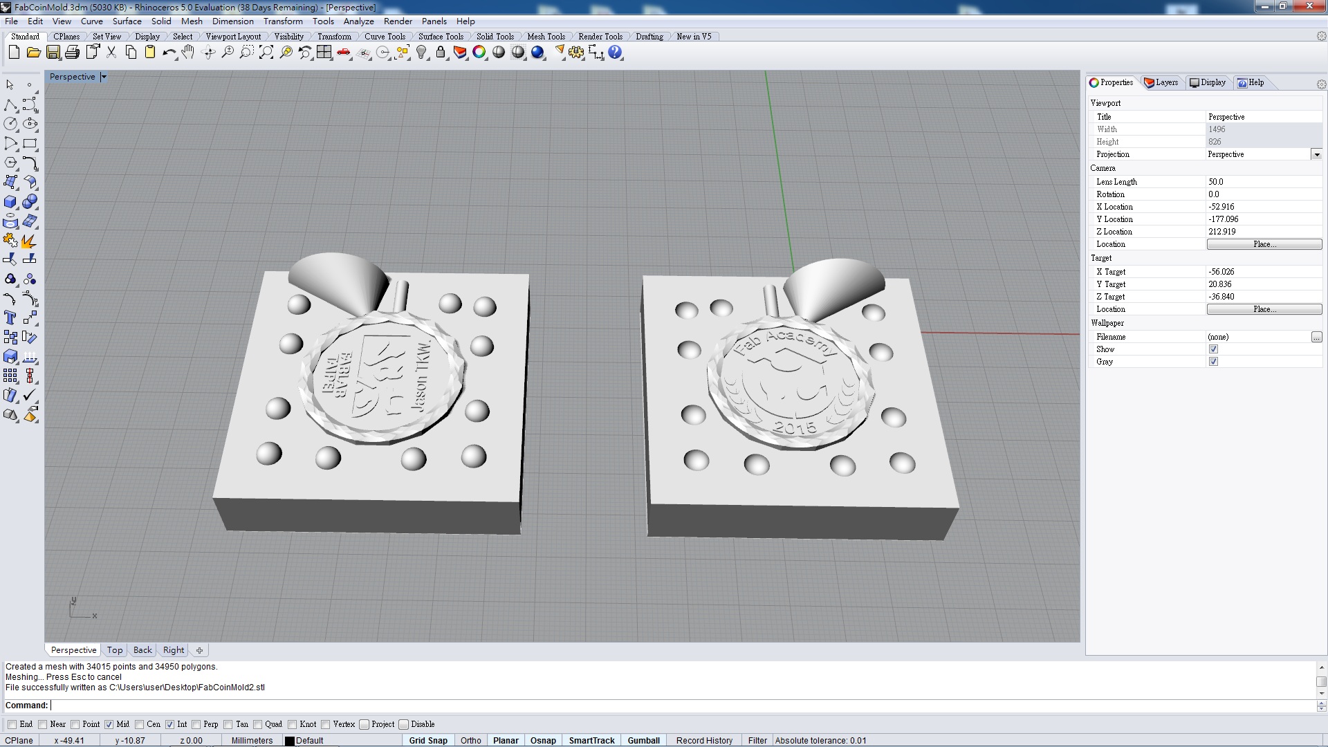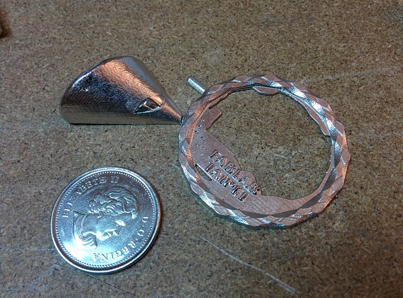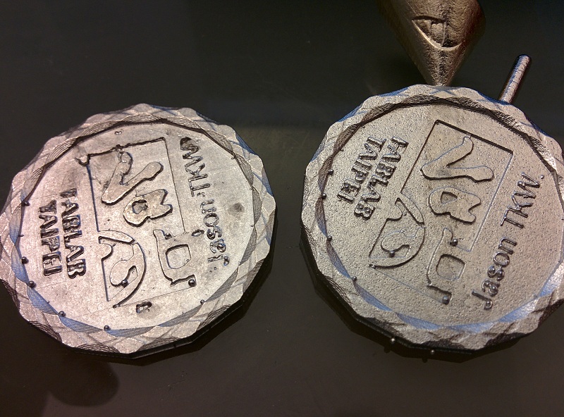 I decide to design and cast a coin with Fablab and Fablab Taipei logos on it. The procedure is as follow: draw the coin in Rhino, CNC the positive mold onto machinable wax, cast the negative with the wax positive, and use the negative mold to cast out the final coin.