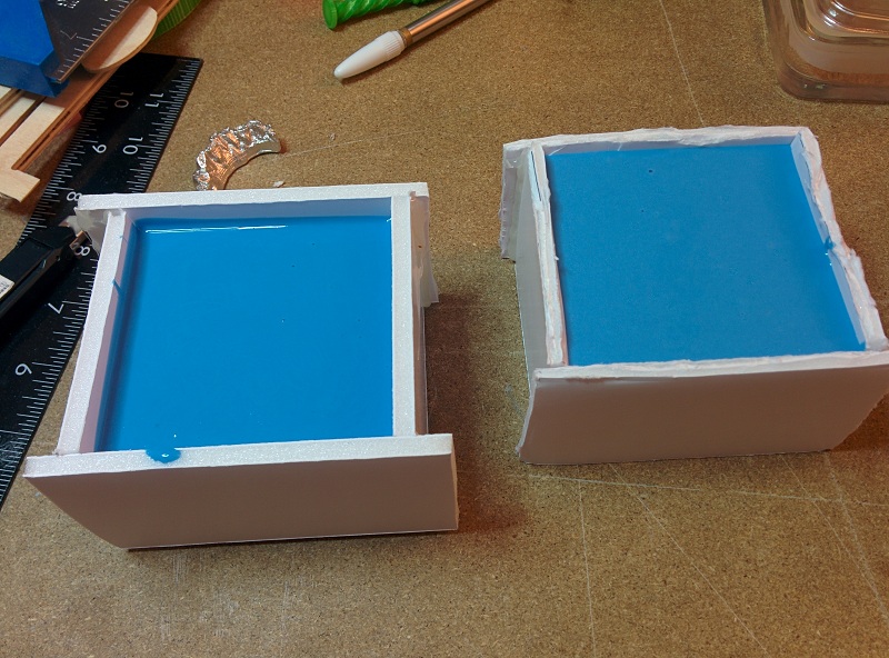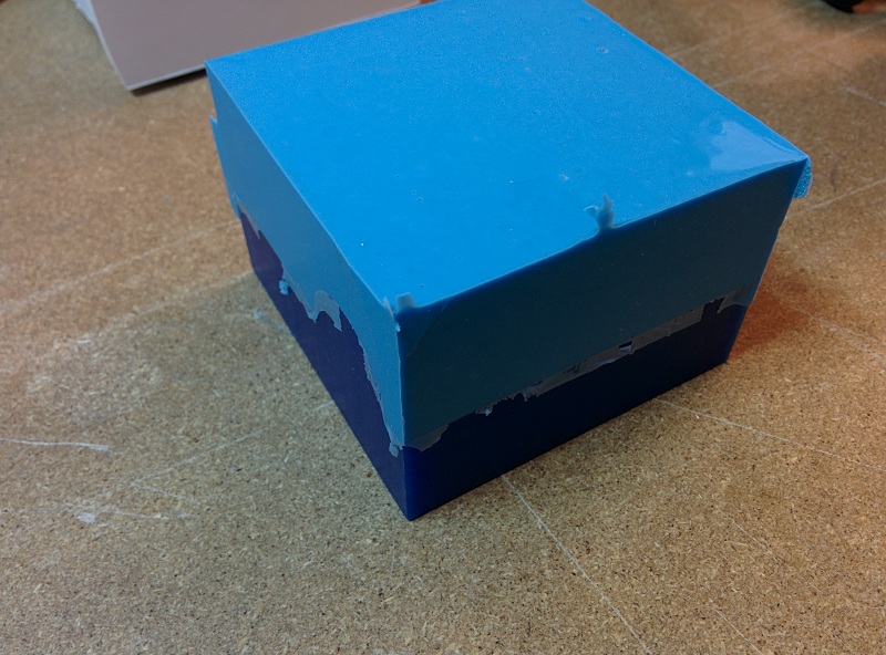 Using foam core panel to build the walls and casting the negative mold with "Smooth-Sil 950". Removing the walls after the mold cures. Mold seperated with some cleaning on the edges. Here comes the problem, bubbles!!! Although the test mold turns out bubbleless without degassing, this one is not that lucky. I will try making the mold again after I finish building/hacking a bicycle pump into a vacuum pump.