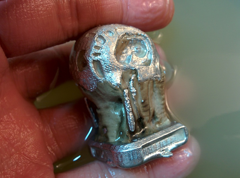 On the right is my first attempt to cast on a laser engraved MDF. It turns out the metal was too hot when I pour. This generated a lot of bubbles that disturb the cooling and give the face a ancient rustic look.