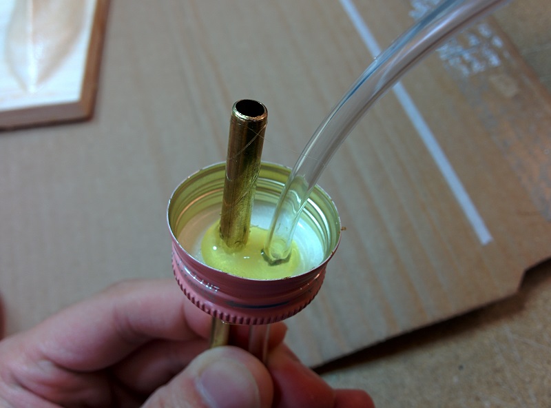 I drill two holes to a glass buttle cap, and insert a copper pipe and a tubing through. Hot glue is used to hold both tube in place while keeping the cap air tight.