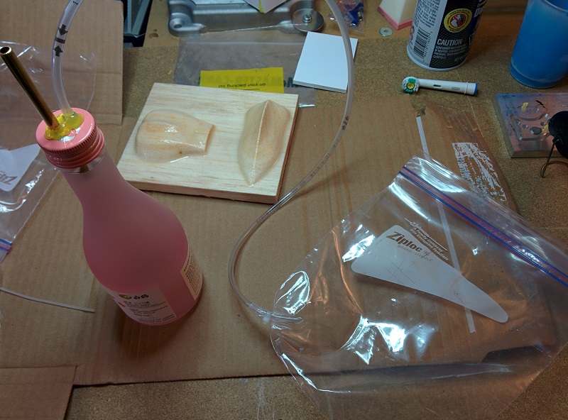 The bicycle have two reversed one way air valve that I made, which reverse the air direction inside the pump. It's not as strong as a real vacuum pump, but works ok for my mold, since I'm after the look more than the strengh of the shell.