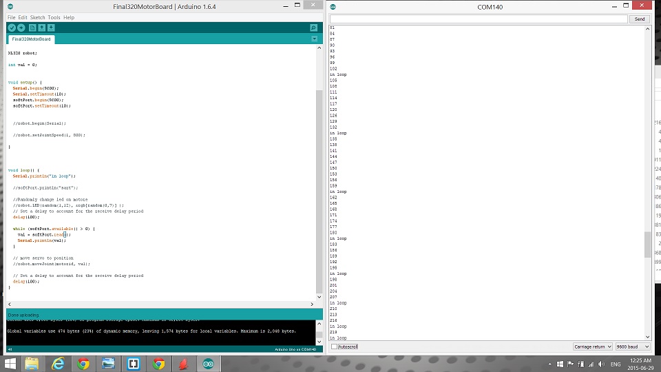 I use the test code first to see the value that my performing unit's bluetooth get. It's the same dual serial process I used last week, and as you can see, it works! The numbers are the angle value that the Android app send to the board.