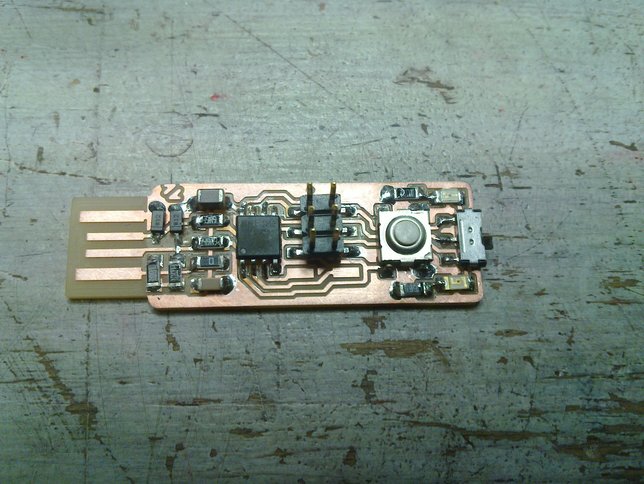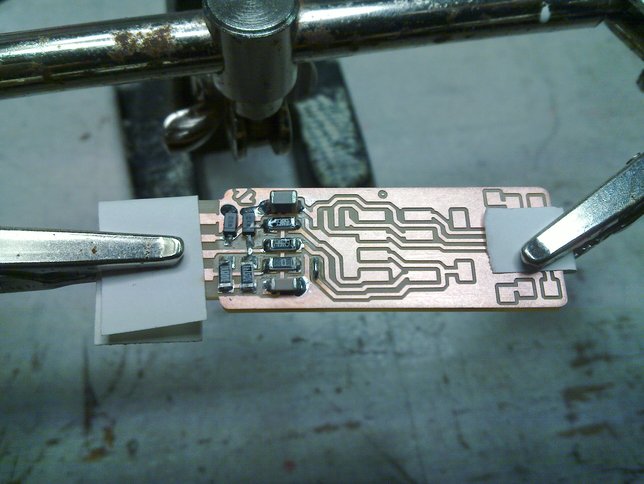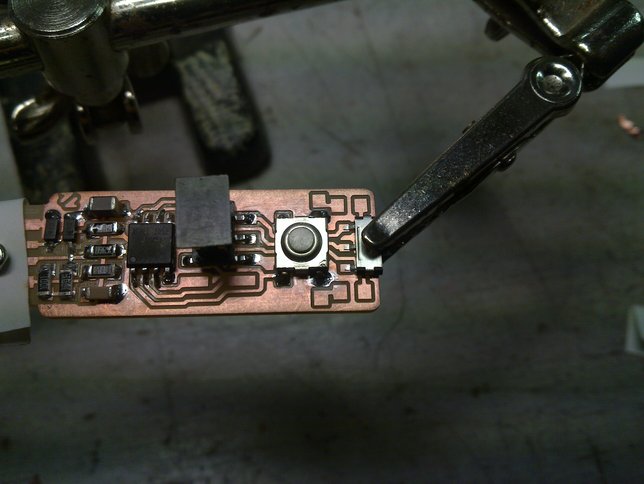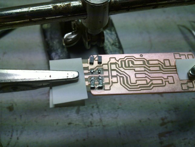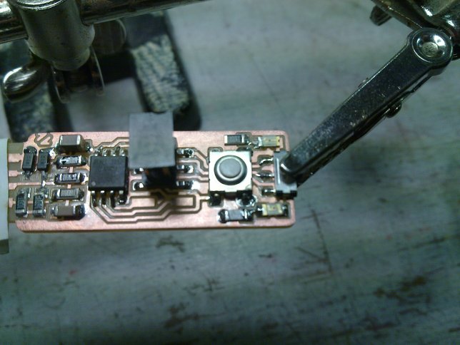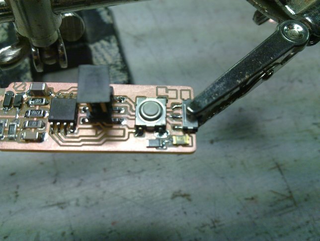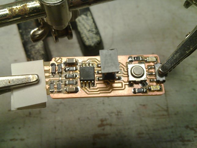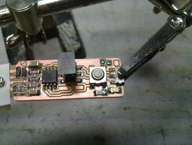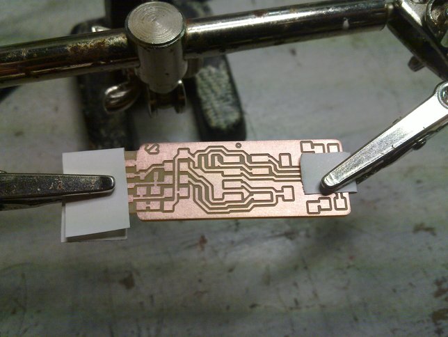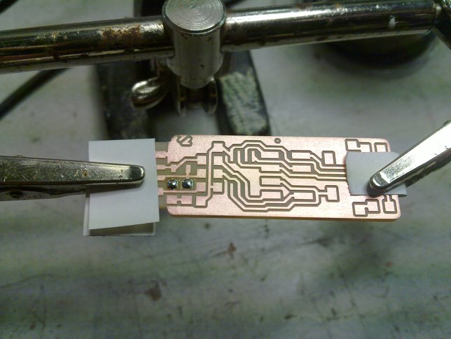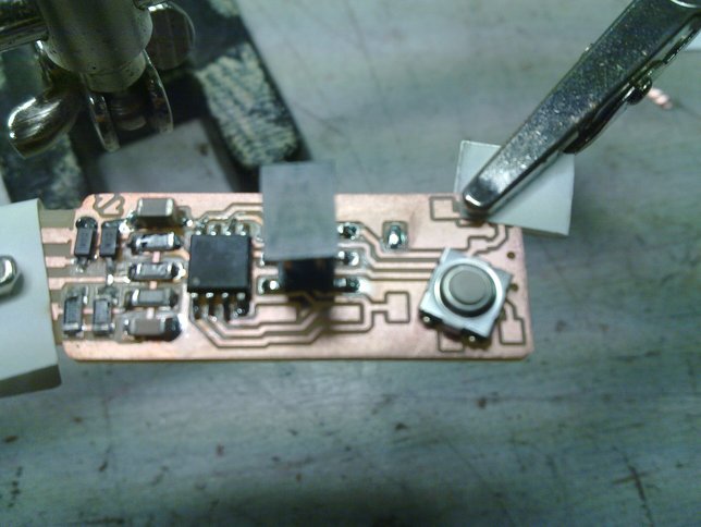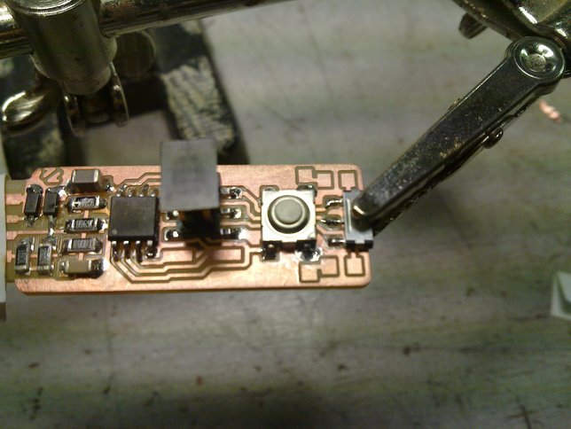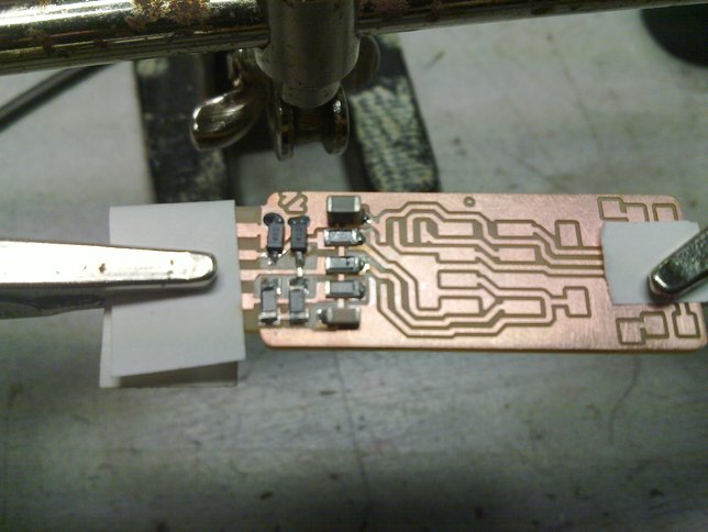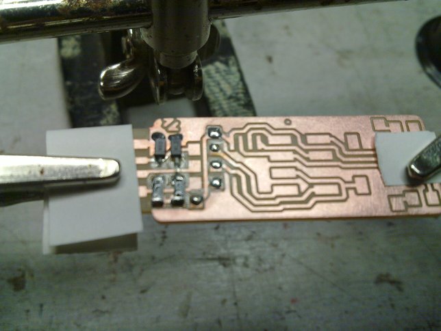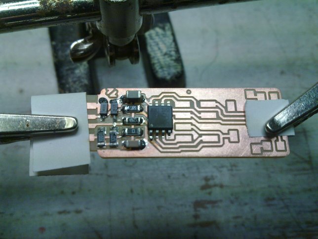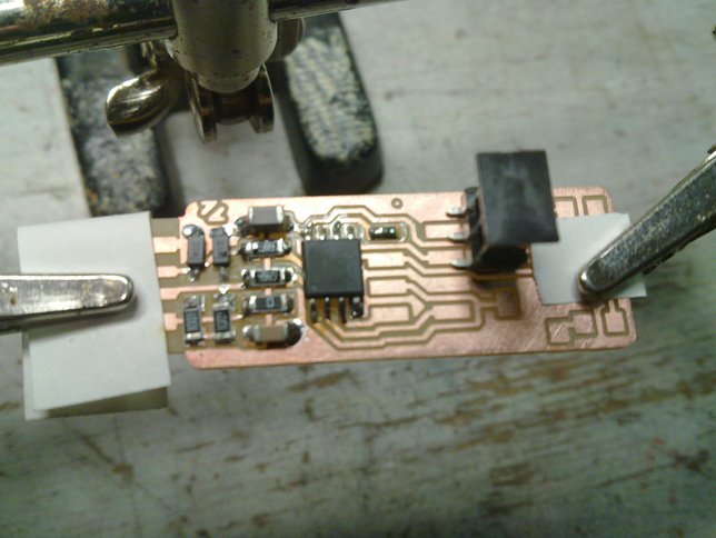 ATTiny soldered in place, first pad tinned for the ISP connector. There are two extra pads at the bottom that aren't used in this particular application.