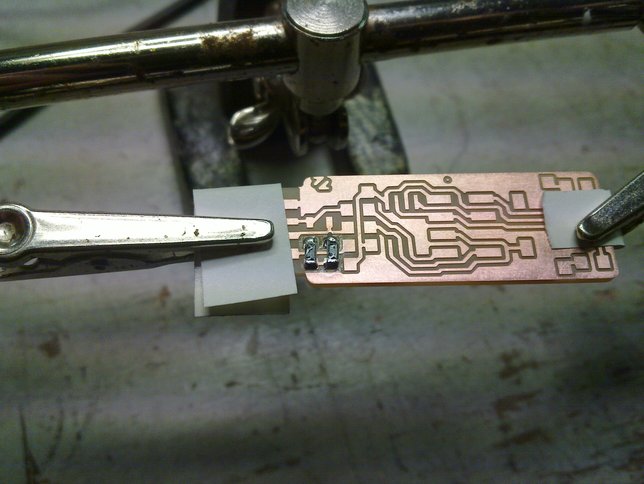 The resistors soldered on both sides. Tinned the pads for the next two components, the 3V3 zener diodes.