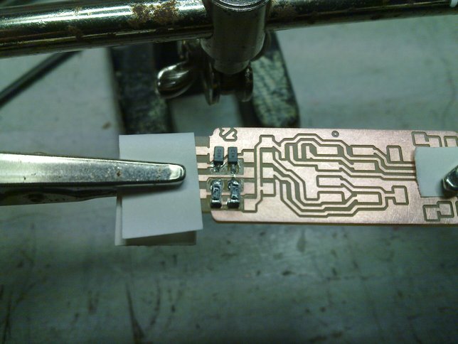 We'll start with two 1K resistors, here are a couple of solder blobs on one side of their pads.