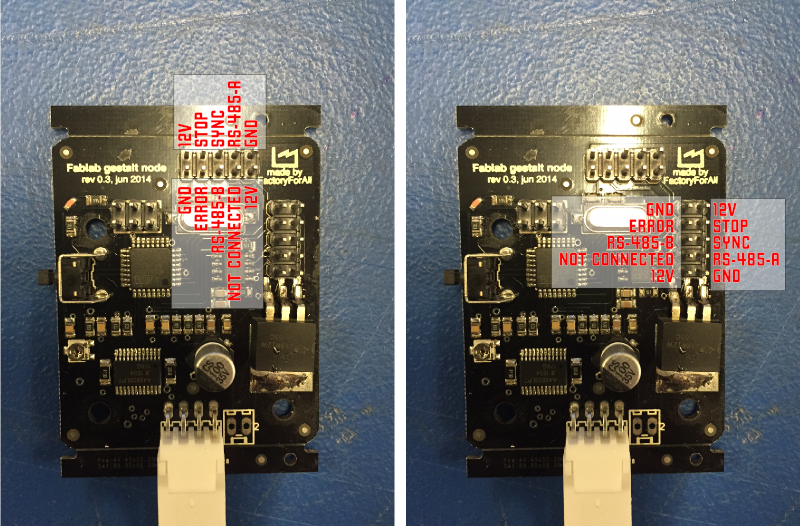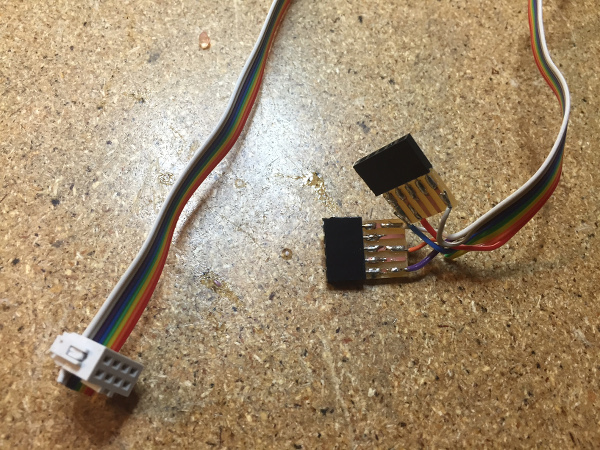 As noted in the instructions, this first cable is not the same on each side; you need to match up the signals according to the pinouts above. The other nodes are daisy chained together using a regular straight through ribbon cable. Double check your grounds and powers for shorts before powering up!