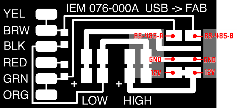 The header on the other side provides power, ground, and the A and B RS-485 signals (or plus and minus; RS-485 uses a differential voltage to help make noise matter less). Here's what those signals are on that header: