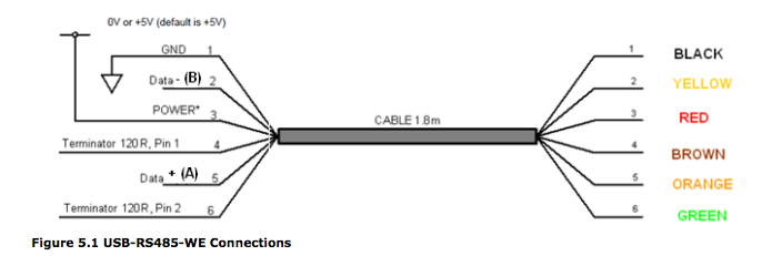The FTDI cable provided is a little different than the other FTDI cables we've been using; it is an RS-485 version. Here's its pinout for reference: