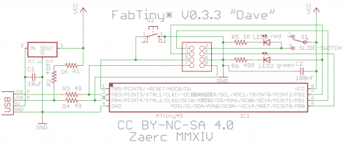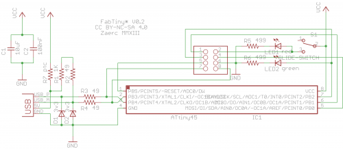 Note that the USB lines are crossed now, this happened to suit the rotated microcontroller better (see below), and as a bonus it instantly solves the minor compatibility problems with the LittleWire and DigiSpark!