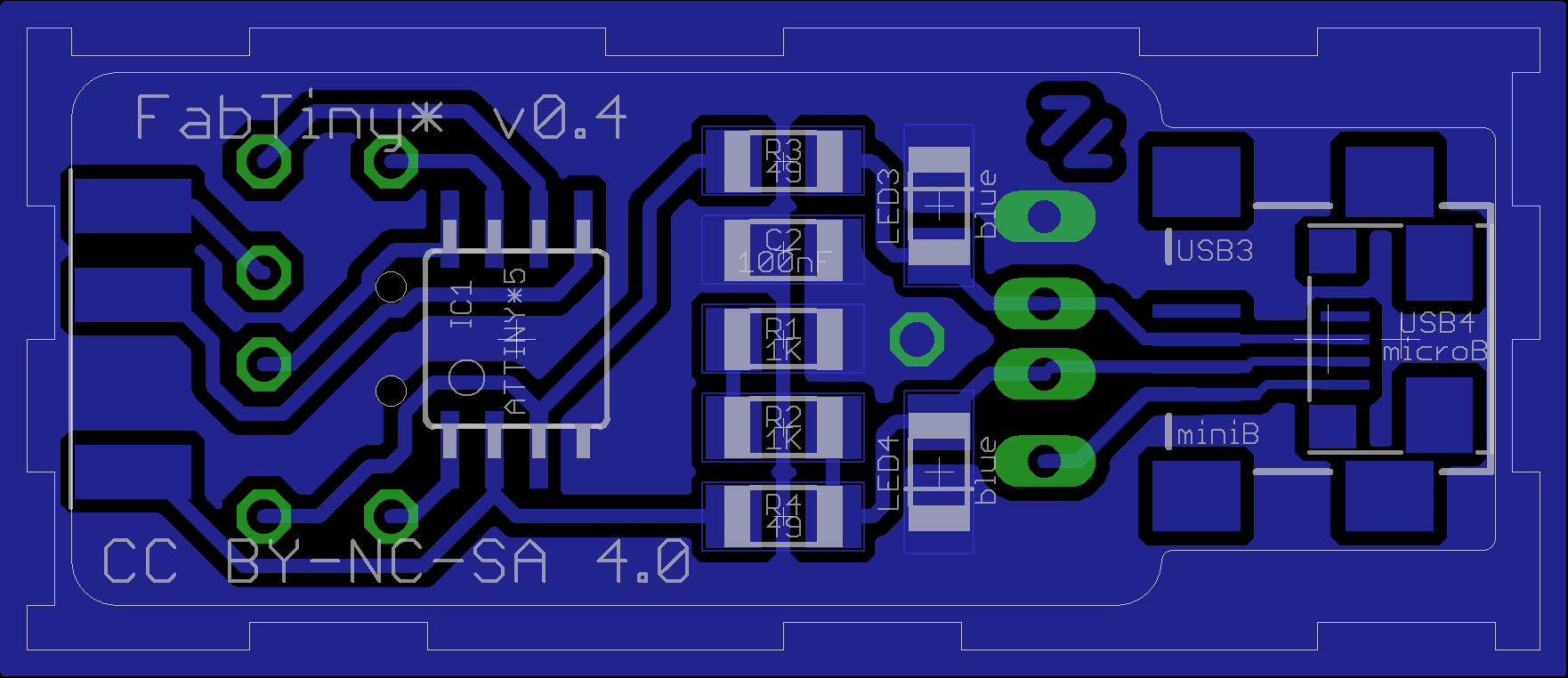 Now have no less then 5 different options for connecting USB: ye ole USB-PCB edge connector, a real USB-A plug or a USB cable, mini-USB and even micro-USB (I just got tired of people asking for more options, and there was room left on the bottom anyway). If you want to use the micro-USB option you'll need to get the milling just right (or be lucky). There is off course also the option to use the 1/100 end-mill, but in that case should replace the footprint with the alternative one designed for the 1/100 mill (that I also added to the fab eagle library, along with the slide-switch plus a few other parts), and generate your own PNGs for milling.