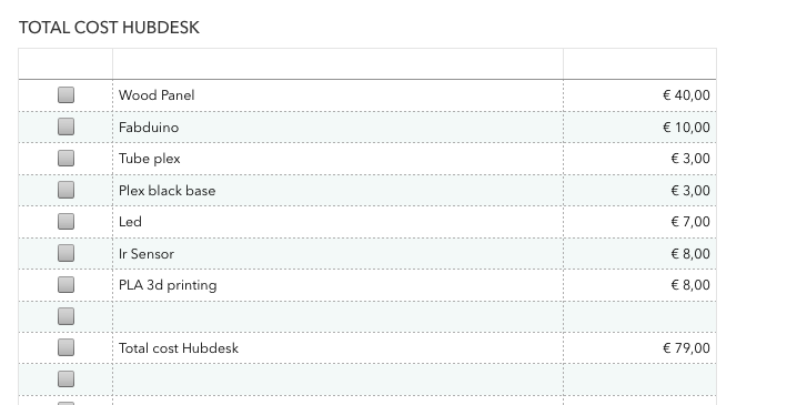 To realize the Hub Desk requires a panel of popular wood, thickness 200 mm, 250 cm for 150 cm (costing 40,00 euro). From the panel you can also have the keys and wood legs.