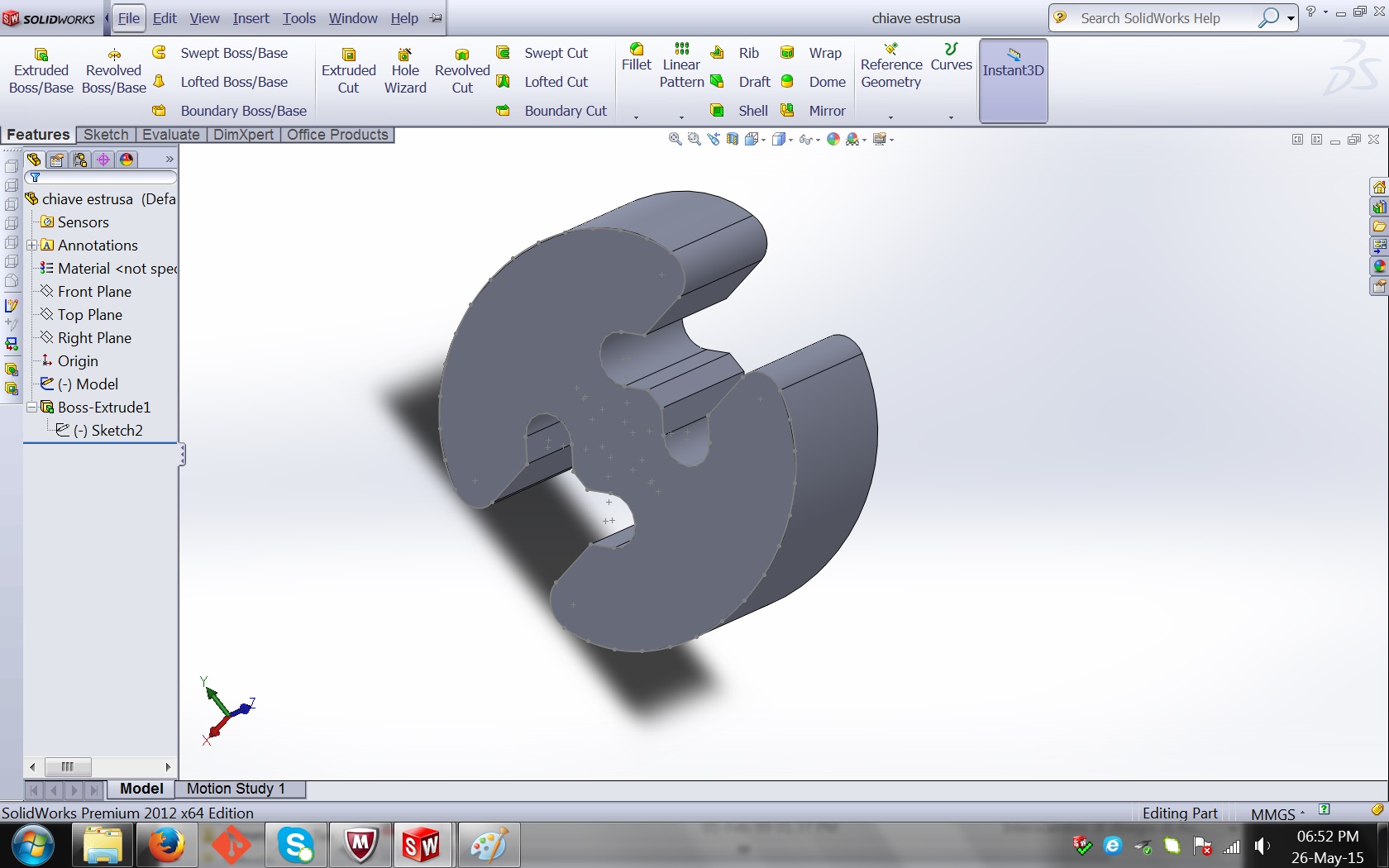 In the following weeks I've used many times the 3d printer as a tool to accomplish part of my final project. In particular, I designed the keys to join the hexagons wood of my desk. I always used to carry out the program solidworks 3D key. With vector files shared (link: http://www.flexiblestream.org/Digital-Wood-Joints-001.php) that I used to design my keys are managed through the extrusion tool with solidwors to give a thickness of 2 cm.