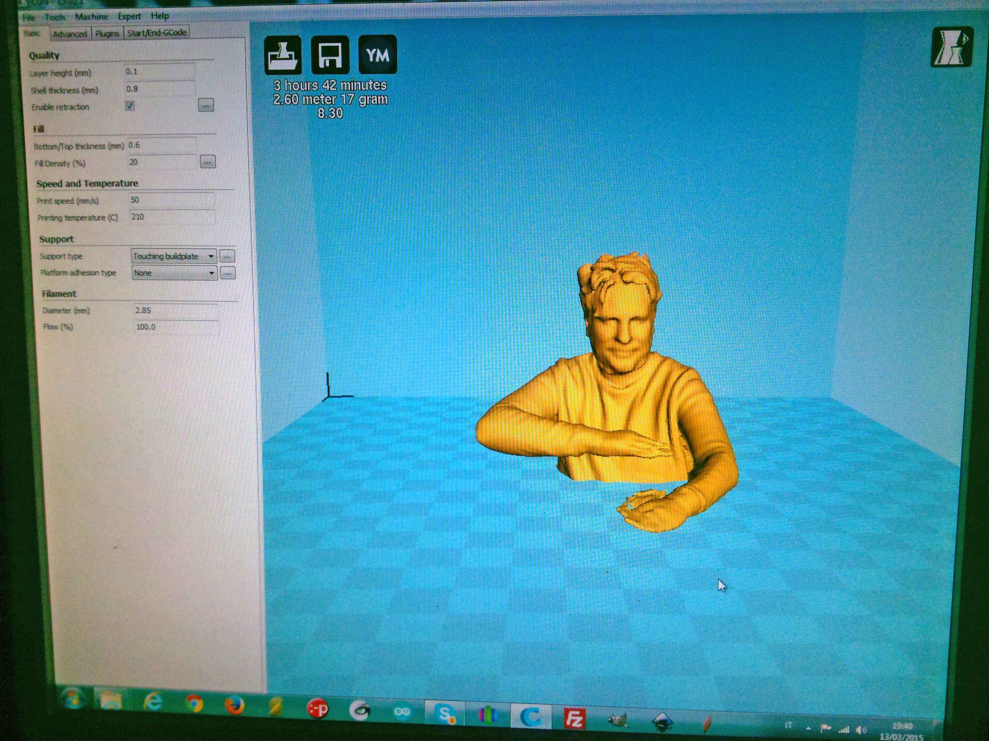 I cleaned the imperfections with the software Netfab. Finally with the software Cura i export the file gcode, inputting all parameters such as media, speed 100 mm/s and temperature 180° for printing .I used PLA orange, the thickness of 2 mm and the fill at 40%. I tried to avoid many support, i raised it at the end.