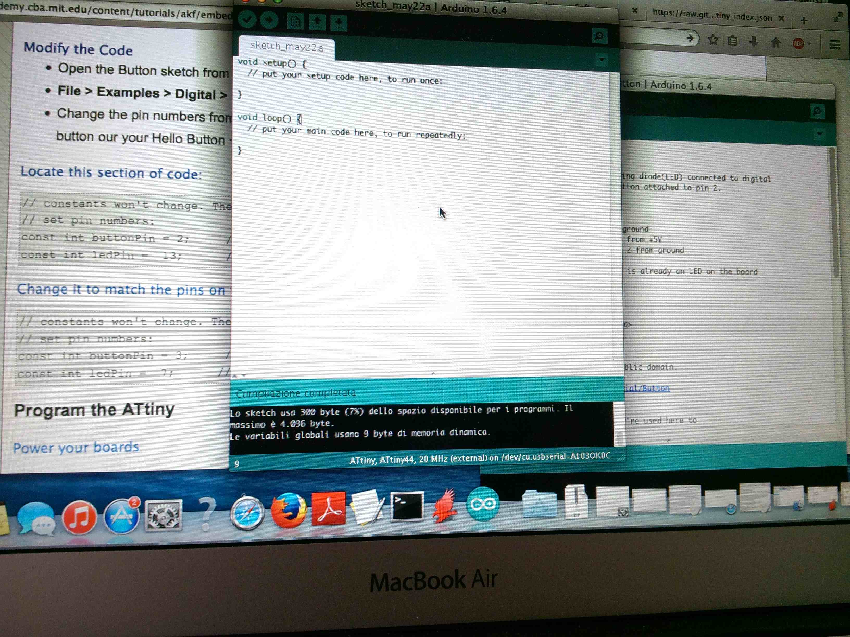 I followed the tutorials to download and install the Arduino software, ATtiny support (driver) and the FTDI driver. I took power from my laptop to the LED and BUTTON ('Hello Echo') board (made in previous week) and connected the FAB ISP to act as a programmer.