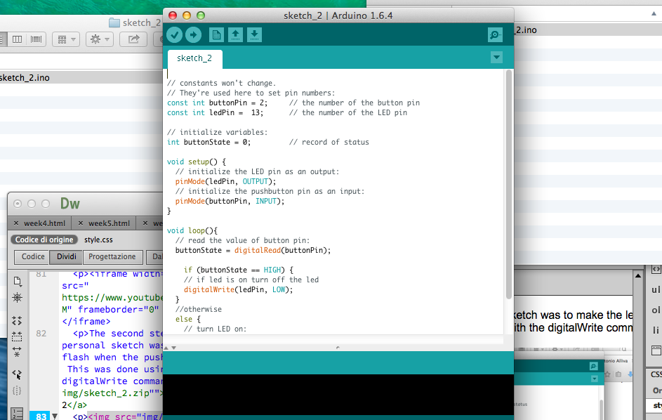 The second step is to do my personal sketch was to make the led flash when the push button was pressed. This was done using a delay with the digitalWrite command. arduino file scketch 2