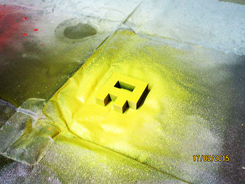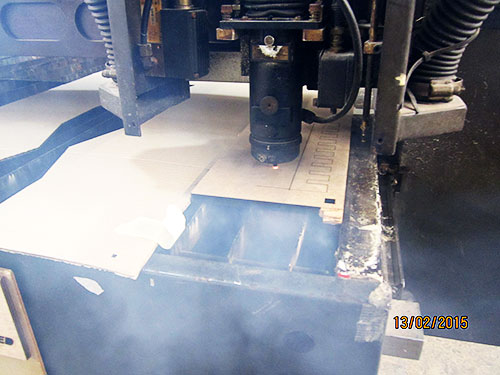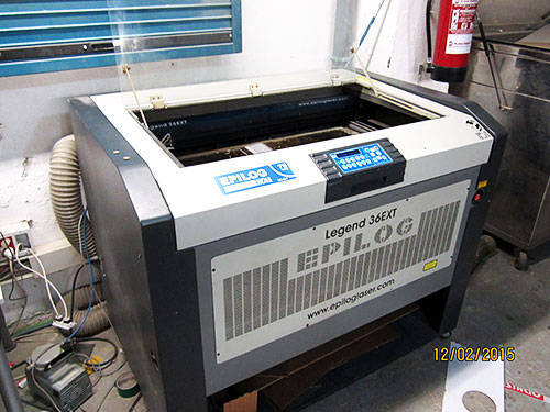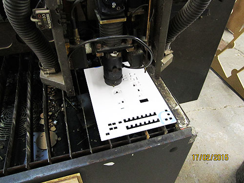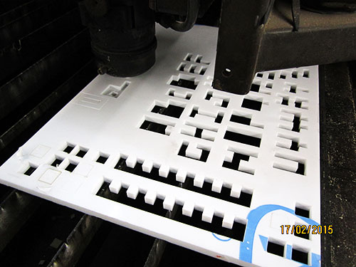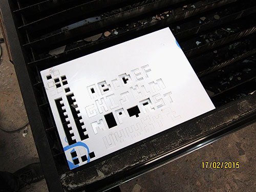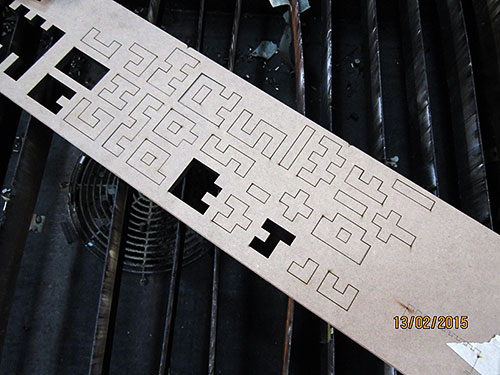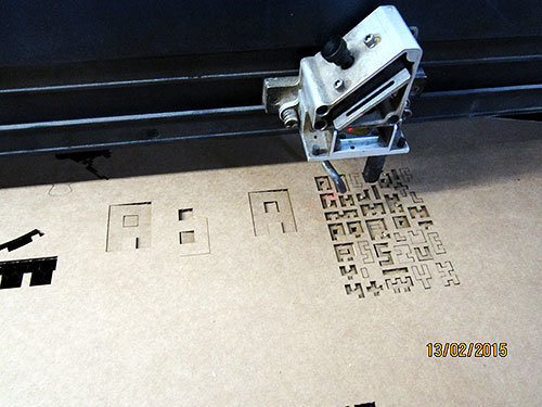 Once ready, it's time to laser cut! First time that I use the machine by myself. Everything seems right, but I have to stop the machine because it's cutting the letters bigger than I expected. Ok, maybe I missed a step, let's repeat from the beginning. The same problem again (you can see on the image, two big "A"). The letters in Rhino were not at the correct size, something happened. I scale the design in Rhino and send it to the machine for the third time. This is the good one.