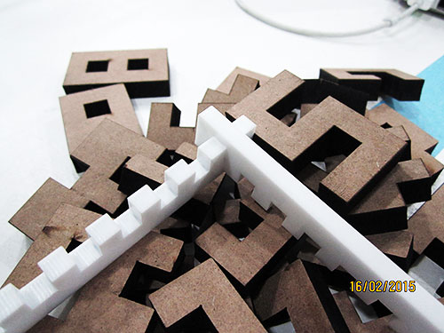 There is "nothing" inside cardboard, so working at this size, cardboard is useless, some letters don't even hold themselves. Nice to see how it look the design IRL, but I need another material. Cardboard of 6mm could be an option, but I prefered to jump directly to MDF, 10mm thickness.