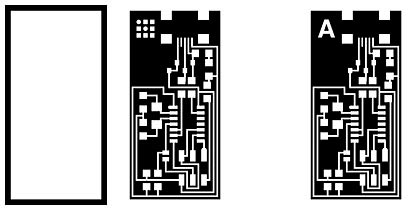 This assignment is divided in three main parts milling, stuffing and programming, but first of all we need the files of the board. Big black and white images that we are going to transform into a working circuit. I chose Neil's board and I changed the logo. First image is the border of the board, second the draw of the circuit, and the third is the same but with an "A" instead of the logo.