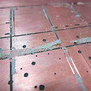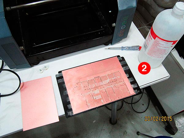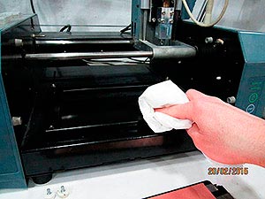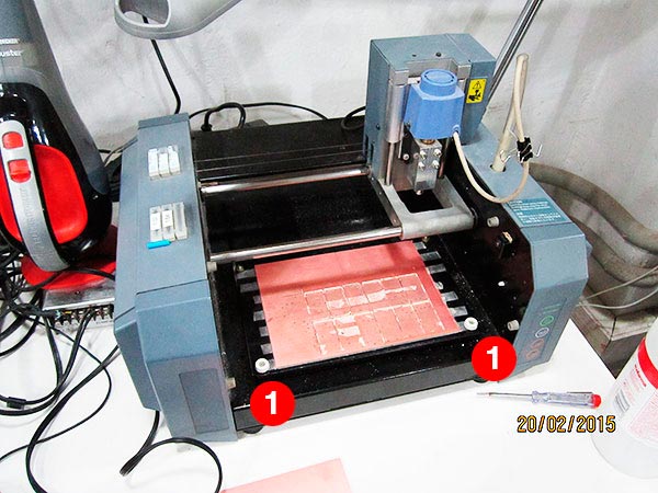Before start milling, we have to clean and setup the machine. I unscrew the bed from the milling machine (1), I remove the rests of the previous PCB and the tape used to fix the material to the bed, and finally I clean the glue with ethyl alcohol (2).