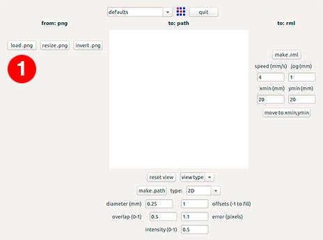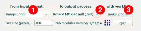 At the computer, open the Fab Modules using the Terminal and the next window will apear to the screen. Select the input format (.png) (1), the output process (Roland MDX-20 mill) (2) and click make_png_rml (3).