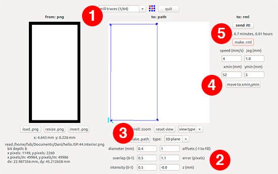 Choose the mill traces (1), set up the Z to "-0.0" and the offsets to "1" (2), "make.path" (3), define X and Y and click "move to xmin.ymin" (4), "make.rml" (5) and "send it!".