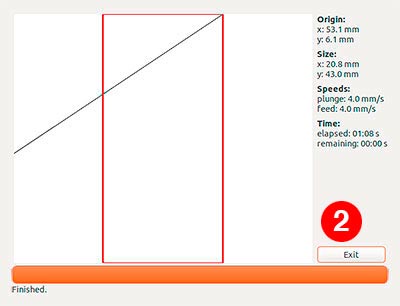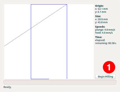 A preview appears on the screen and you can click "Begin Milling" (1) to send the job to the machine. The same button change to "Abort" to abort the milling, and when it finishes, to "Exit" (2).
