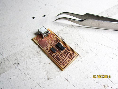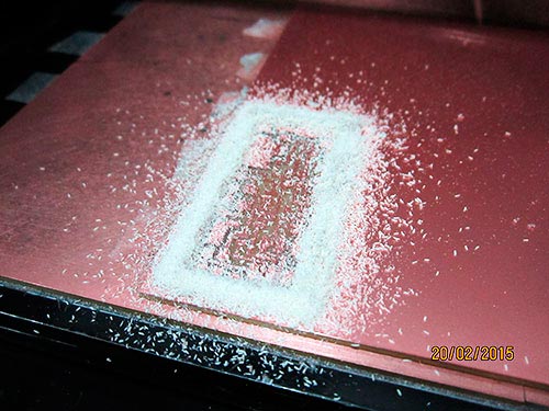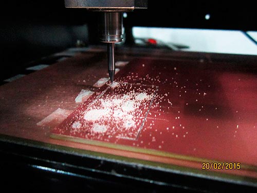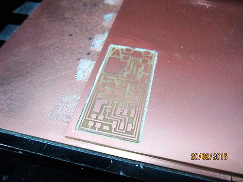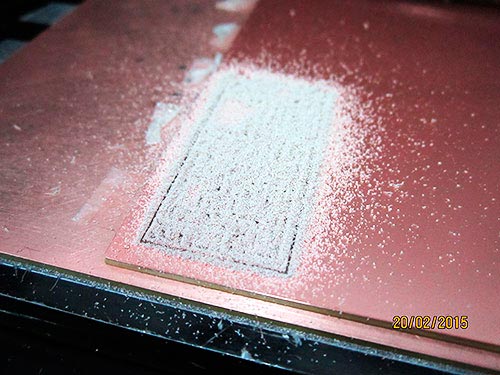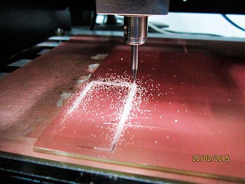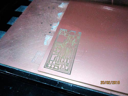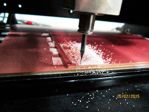 After 10 minutes of milling, the first file becomes real on the surface of the PCB.