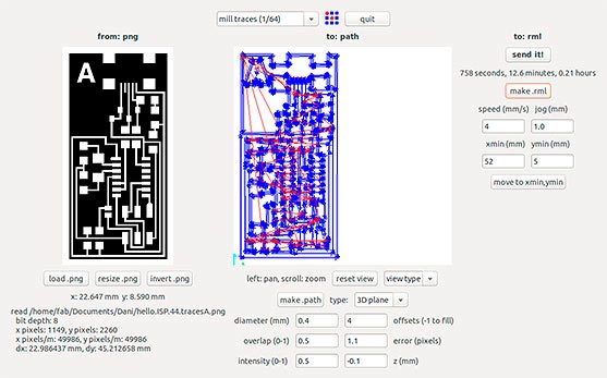 I repeat the steps to load an image, this time the drawing of the circuit, and I change the Z to "-0.1" to be sure that I am going to perforate the whole draw. I also change the offsets to "4". "Send it!" and "Begin Milling".