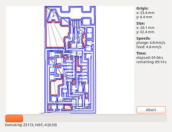 …and we select the one with just the border. This file is for the cutout, we use it at the beginning to check that the bed is completly flat and that we set up the Z position correctly. The idea is to scratch just the surface, engrave the border of the board over the PCB to check the depth of the milling.