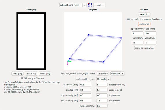 It's time to cut out the board. I change the mill bit to a big one (1/32"). I load the new file and change offsets to "1", top z to "-0.5", bot z to "-1.5" and cut depth to "0.5".