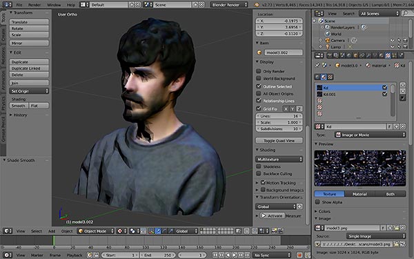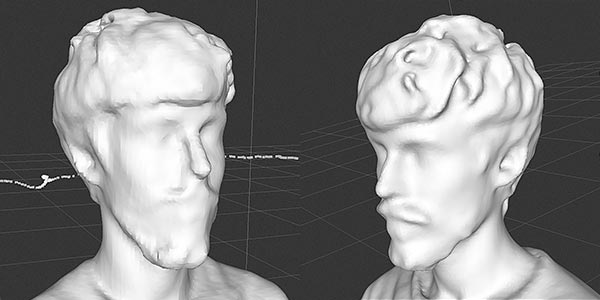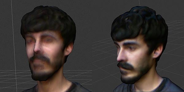 ...and Théo scanned me, twice. Yeah, the first one I was talking, opening/closing my eyes... and the result is a blurry capture. Below you can see the comparison between the two scans, with and without texture. Moving parts don't appear on 3D scans.