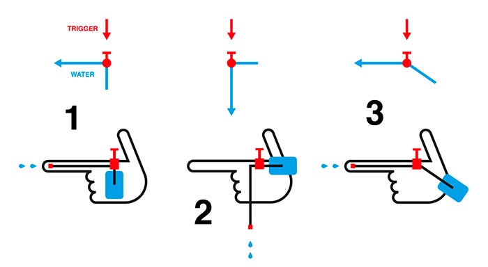 The next schema will help me to explain what I would like to do. The first illustration shows the ideal design. The water container is in your palm, you can hold it with your fingers, the trigger is pointing up, to use it with your thumb, and the water goes out in the direction that you are pointing with your index finger. The second illustration shows the original pumping mechanism, over the hand, keeping the trigger at the same position. You can see the different water path. At the third illustration you can see the final result. I just need to modify one piece of the mechanism to reach that.