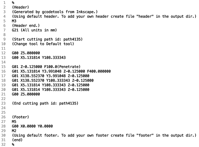 Next step is to send the movements we want to the machine. I used (gcodetools from Inkscape) to generate some g-code quickly to analyse its structure (image below). Because we want to use the Nadya's python example, we need to "clean" the g-code in order to get only an array of coordinates. Ferdi shows us some tricks in Sublime Text to clean the g-code without programming anything.