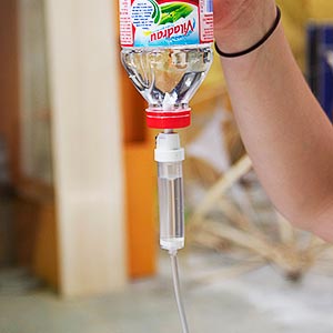 Because we didn't had yet the bearings to assemble the peristaltic pump, we decided to find another solution. A dropper would be the perfect alternative, the kind of dropper that you can see in the hospitals to dispense the serum to the patients. We can adjust manually the frequency of drops. Theo is the responsible to design and 3D print a support to fix the extreme of the dropper to the machine.