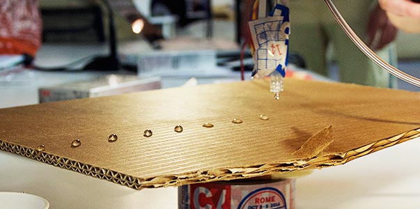 We turn the machine on the first time, using a cardboard as a canvas. Unexpectedly, the cardboard doesn't absorbs the drops of water, so we put the cardboard a little bit higher, enough close to the dropper to receive the drops smoothly and as a result we get a surface filled with little blobs of water that look like small crystal pearls, beautiful!
