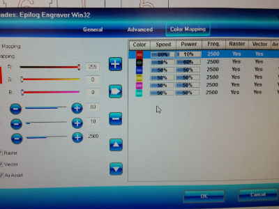 The laser cutter is an Epilog Engraver. All the laser cutter settings