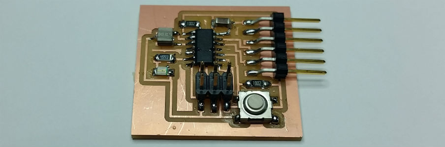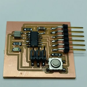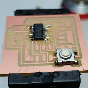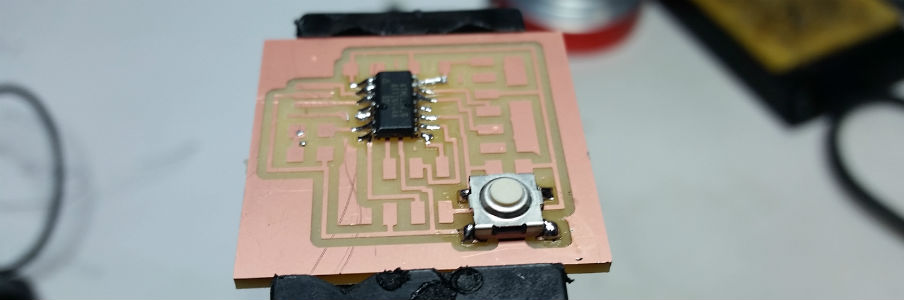 Load the Neil's board on Eagle software, add a LED and a Button, export traces, set the mill machine (Roland SRM-20), mill the PCB and solder components.