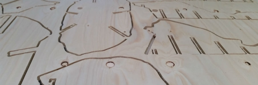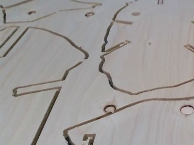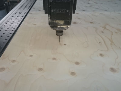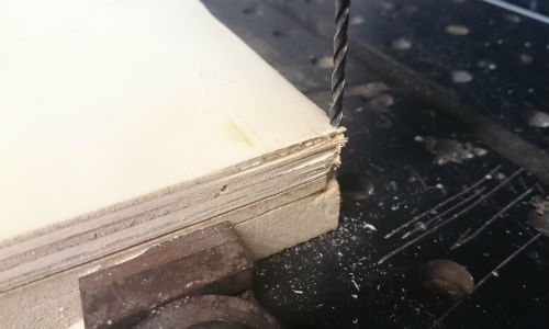 Start operating the Shopbot. First making the drills to screw (3mm tool), introduce screw in order to keep in place the piece of wood and after the cut (6mm tool). The tool is changed manually.